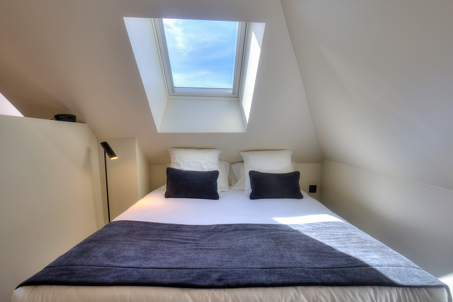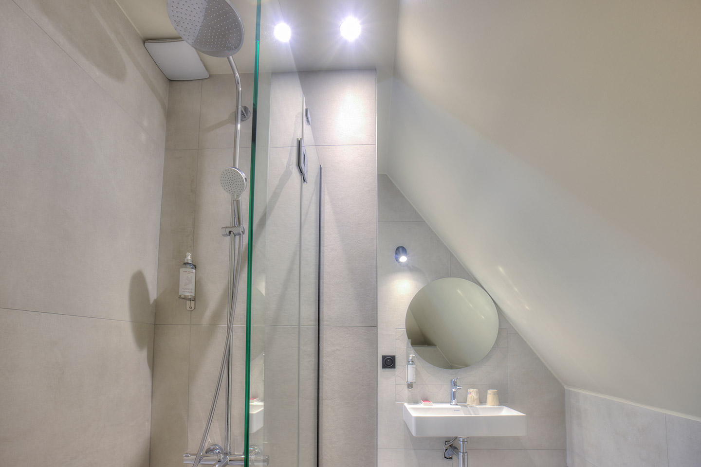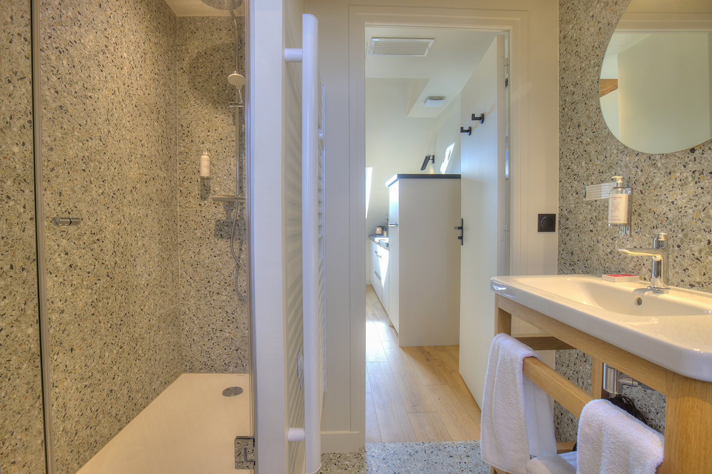 Separates Schlafzimmer mit Doppelbett (160/180 cm) und Bettwäsche. Badezimmer mit Dusche, Handtüchern und kostenlosen Pflegeprodukten.