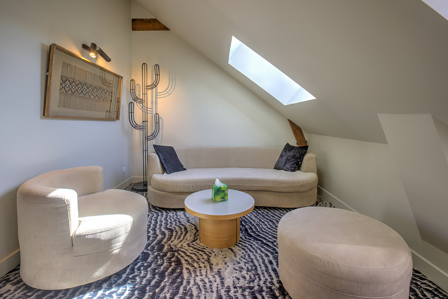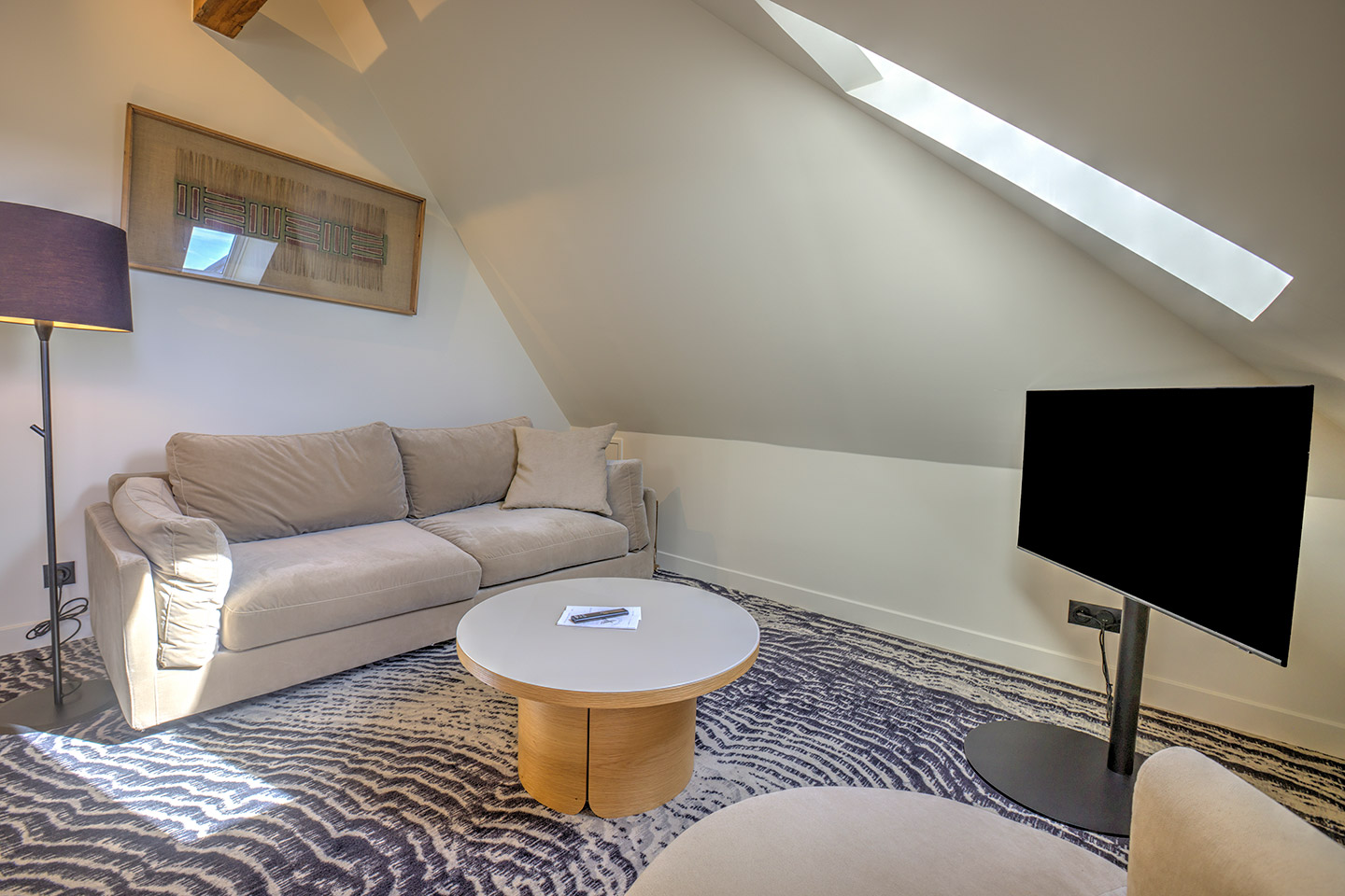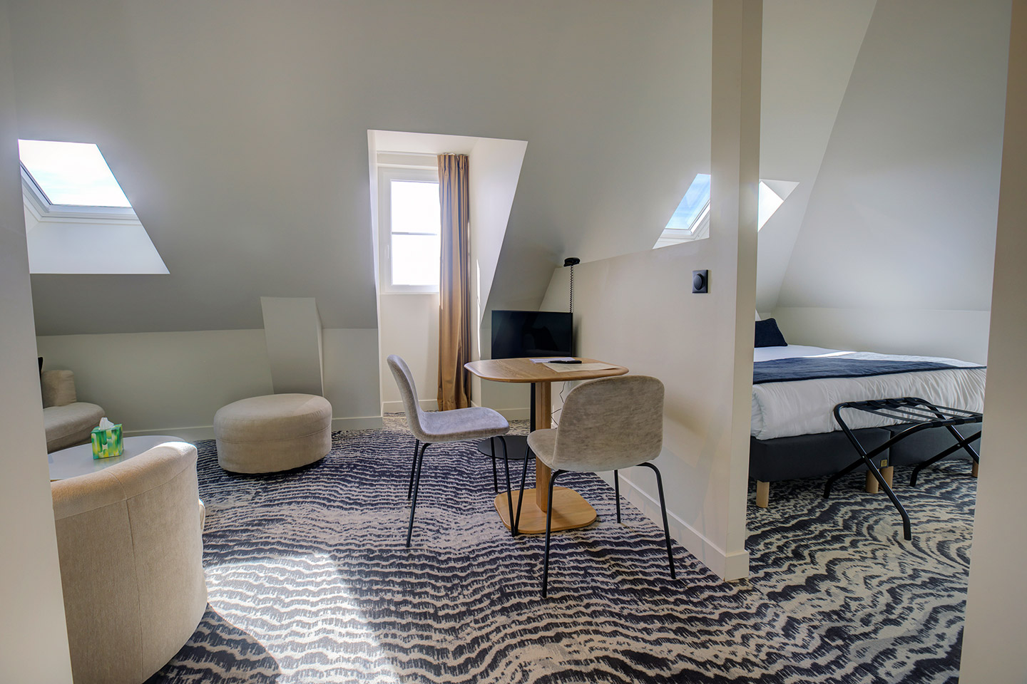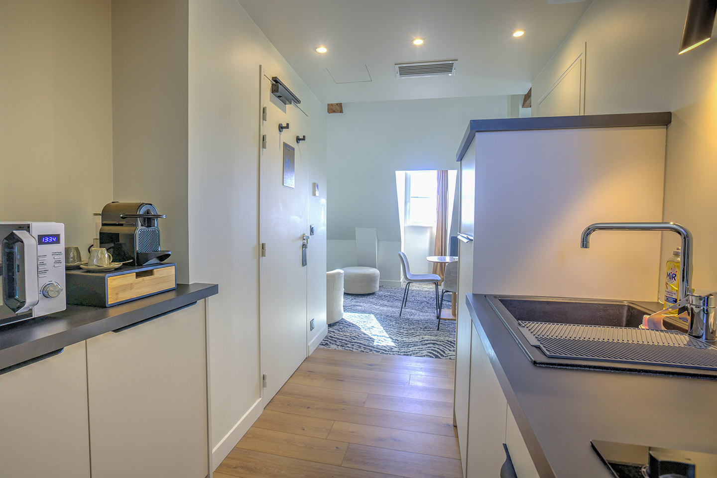 Séjour spacieux dans un appartement de 55 m2 avec une cuisine équipée et un espace salon (avec canapé réversible pour 2 enfants) et un coin salle à manger.