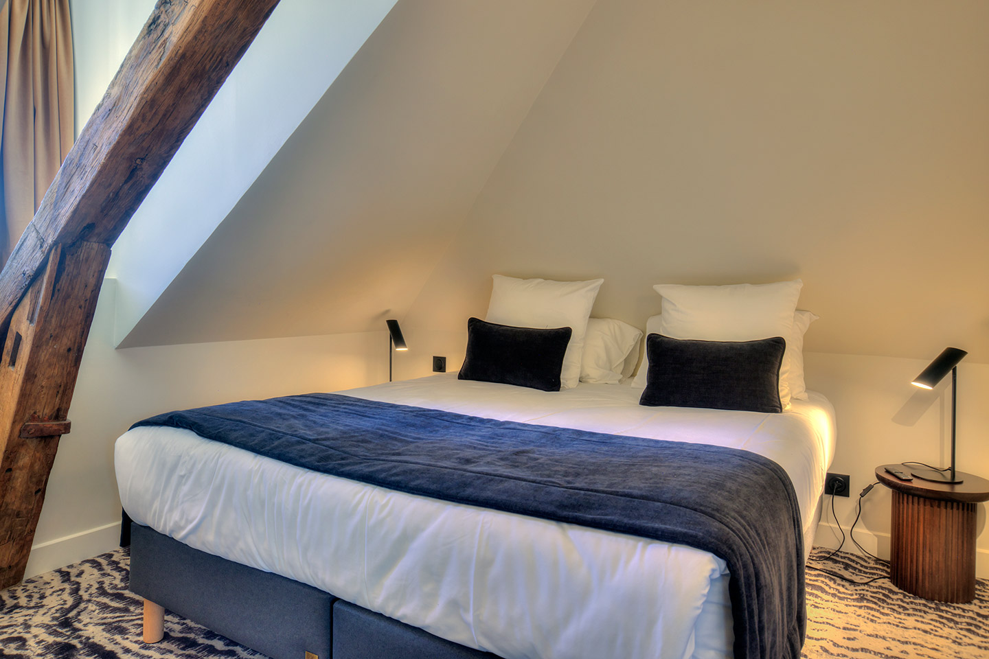 Chambre séparée avec lit double en 160/180 et linge fourni. Salle de bain avec douche, linge de bain et produits de toilettes gratuits.