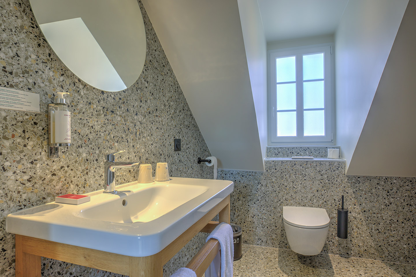 Salle de bain avec baignoire-douche, linge de bain et produits de toilettes gratuits.